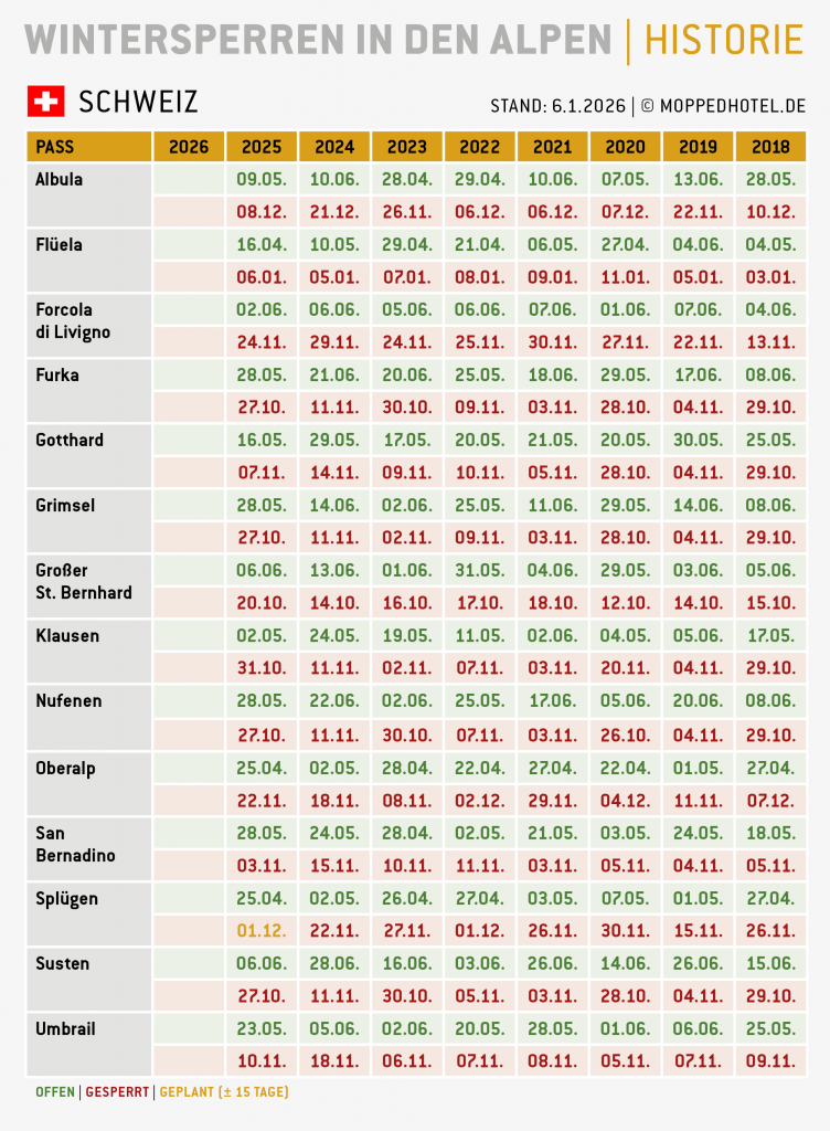 Die hier aufgeführten Termine sind die von offizieller Seite veröffentlichten Öffnungs- und Schließdaten der Pässe. Natürlich kommt es in der Übergangszeit Herbst-Winter bzw. Winter-Frühling aufgrund des Wetters, Lawinengefahr, Murenabgängen, Straßenschäden o.ä. immer wieder zu temporären Sperrungen, auch wenn die Pässe offiziell keine Wintersperre mehr haben. Manchmal sind die Pässe wegen guten Wetters auch schon ein paar Tage vor der offiziellen Öffnung befahrbar.